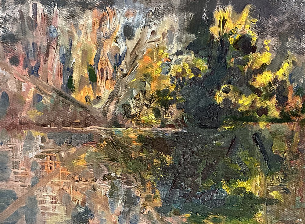 “En Plein air” is a French term that translates to “painting in the open air”. Though the French Impressionists brought new awareness and excitement, painting on location is a tradition that dates back centuries. There is a certain life force that exists in plein air painting; it is a ‘live performance’ so to speak. A moment in time capturing nature’s many moods without preemptive strikes. The light-charged particles glowing in the atmosphere, the birds and crickets singing, fragrances of fruits and flowers floating in the air, infuse the paintings with a fresh and honest expression.
